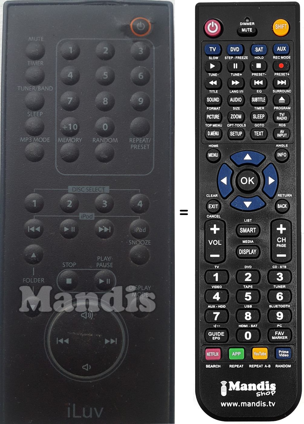 El comandament equivalent realitza totes les funcions, fins i tot quan el comandament original controla diversos aparells. Al comandament equivalent es poden programar diferents aparells amb els boton TV, DVD, SAT i AUX, d'aquesta manera es poden incloure totes les funcions del comandament original. Si si visualitza el manual de les tecles (instruccions del comandament a distància) podrà comprovar que hi ha totes les funcions.
