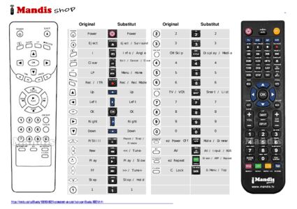 A continuació, us mostrarem la correspondència entre cada un dels botons del comandament original i el botó que realitza la mateixa funció en el comandament de substitució. En alguns casos, és possible que necessiti prémer la tecla SHIFT abans de prémer un altre botó per realitzar certes accions. Aquestes funcions addicionals sovint no s'utilitzen gaire i s'inclouen per facilitar la comprensió del comandament de substitució, o perquè el comandament original té més botons que el seu equivalent.