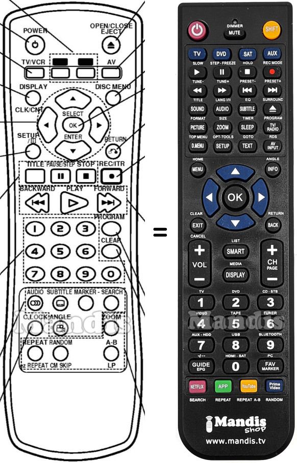 Sí, el comandament equivalent realitza totes les funcions, fins i tot quan el comandament original controla diversos aparells. Al comandament equivalent es poden programar els camps de diferents aparells (TV, DVD, SAT i AUX) d'aquesta manera es pot incloure totes les funcions del comandament original. Si si visualitza el manual de les tecles (instruccions del comandament a distància) podrà comprovar que hi ha totes les funcions.