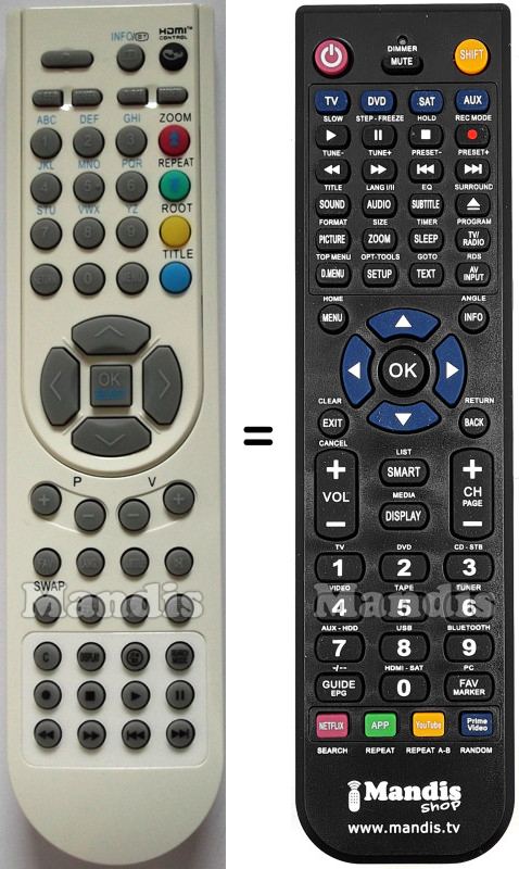 Sí, el comandament equivalent realitza totes les funcions, fins i tot quan el comandament original controla diversos aparells. Al comandament equivalent es poden programar els camps de diferents aparells (TV, DVD, SAT i AUX) d'aquesta manera es pot incloure totes les funcions del comandament original. Si si visualitza el manual de les tecles (instruccions del comandament a distància) podrà comprovar que hi ha totes les funcions.