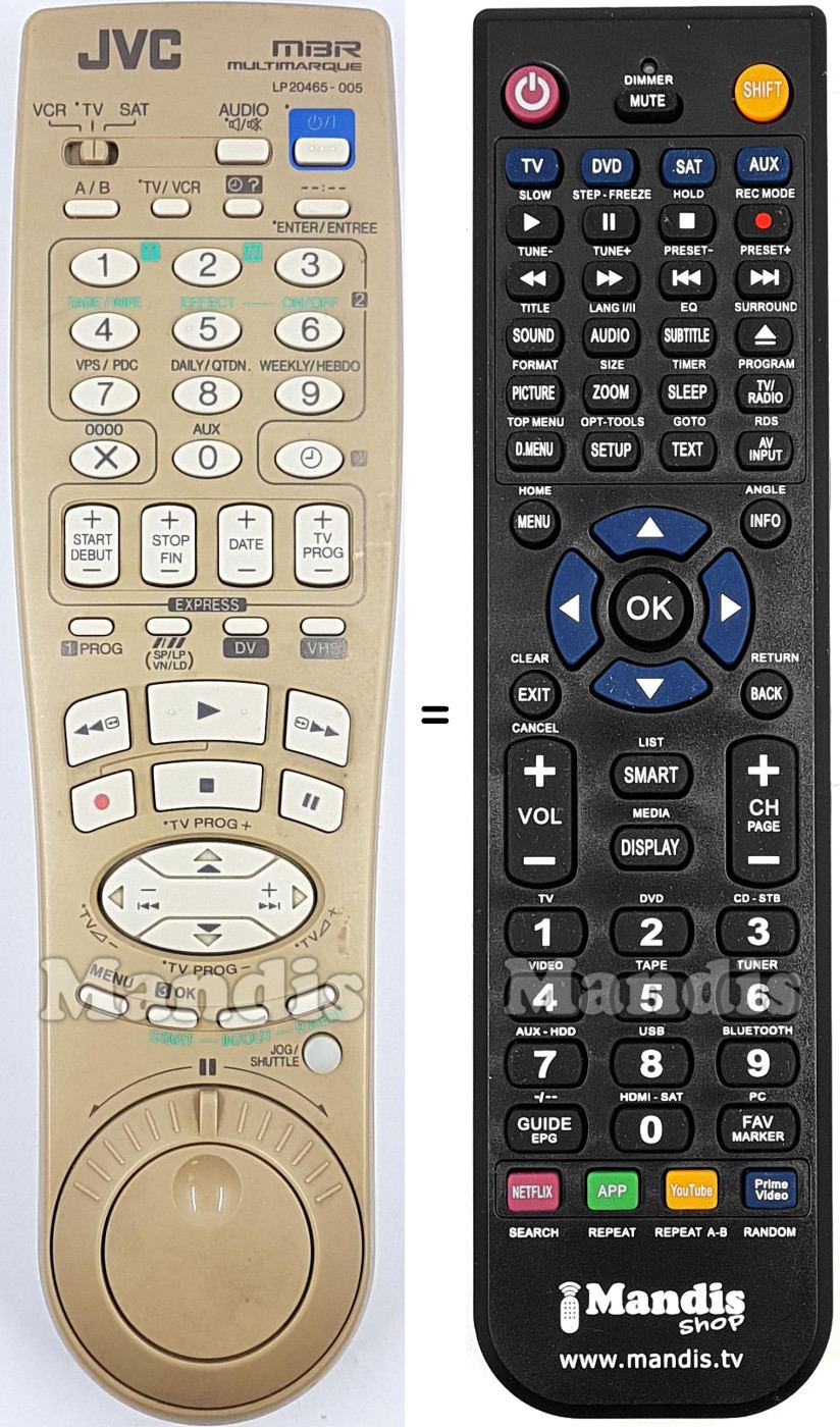 Aquest comandament a distància substitueix completament el teu LP20465-005 en totes les seves funcions. No és un comandament universal, sinó una còpia exacta del teu original.
