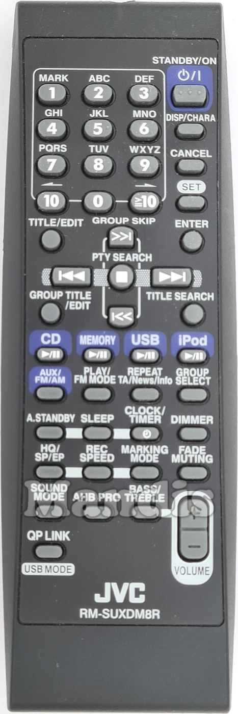 Comandament a distància original RMSUXDM8R que serveix per equips de música i receptors av de la marca JVC. Es tracta d'un model original de comandament a distància.