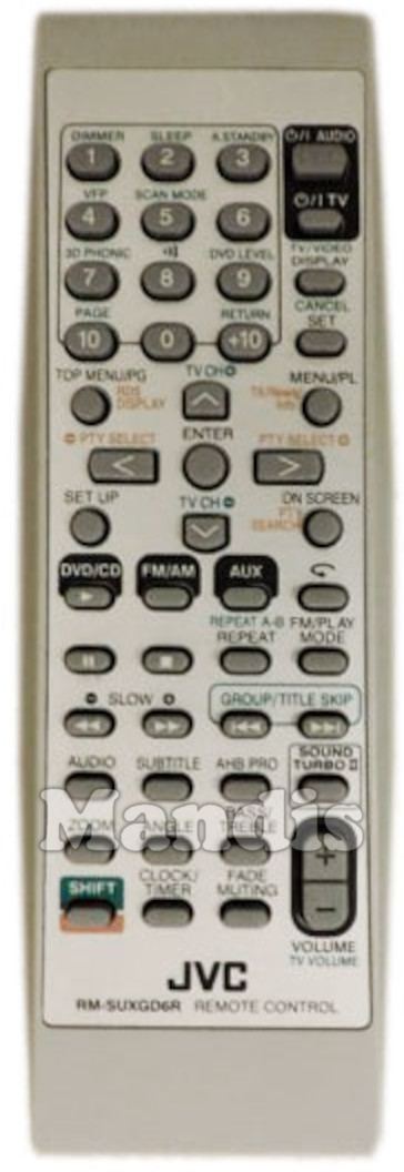 Comandament a distància original RMSUXGD6R que serveix per equips de música i receptors av de la marca JVC. Es tracta d'un model original de comandament a distància.