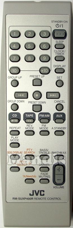 Comandament a distància original RMSUXP400R (RM-SUXP400RW2) que serveix per equips de música i receptors av de la marca JVC. Es tracta d'un model original de comandament a distància.