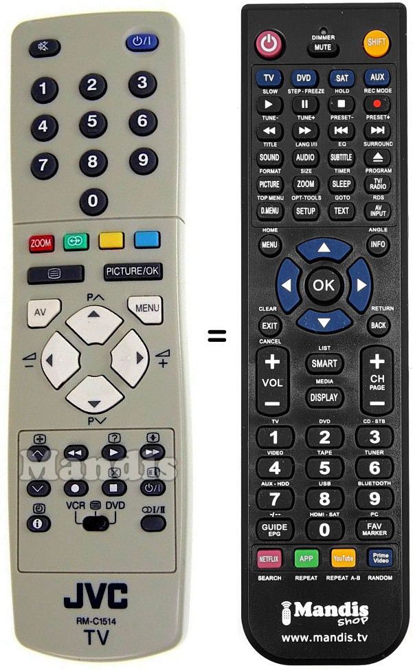 Comandament a distància que substitueix el comandament RM-C1514 (BE5F2602W001) en totes les seves funcions.