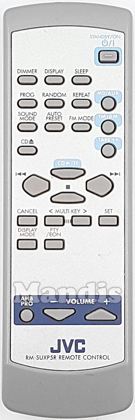Comandament a distància original RM-SUXP5R que serveix per equips de música i receptors av de la marca JVC. Es tracta d'un model original de comandament a distància.