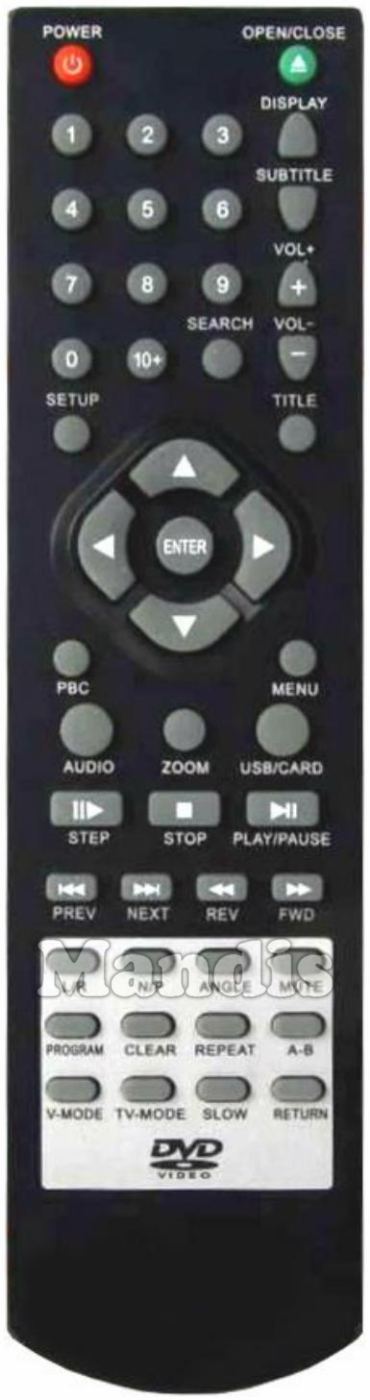 Power, Open / Close, 1, 2, 3, 4, 5, 6, 7, 8, 9, 0, 10+, Search, Display, Subtitle, Vol +, Vol -, Setup, Title, Up, Right, Down, Left, Enter, PBC, Menu, Audio, Zoom, USB / Card, Step II>, Stop, Play / Pause, I<< Prev, Next >>I, << REV, FWD >>, L/R, N/P, Angle, Mute, Program, Clear, Repeat, A-B, V-Mode, TV-Mode, Slow, Return