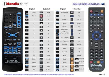 Aquest comandament a distància fa totes les funcions del comandament original: Power, Power TV, Power VCR, Power DVD, 1, 2, 3, 4, 5, 6, 7, 8, 9, 0, +10, LSTN M. / Return, Set Up / Menu, Sound / OSD, PTY, RDS Disp., Up, Down, Left / I<< / P.Call -, Right / >>I / P.Call +, << / Tuning -, >> / Tuning+, Cine EQ. / Enter, Play/Pause / Band, B.Boost, Disc Skip / A/B+100, Stop / Auto, DVD / Pause, Phono / Title, CD/DVD / TV Sel., Tuner / Input Sel., Video 1 / DVD I<<, Video 2 / DVD >>I, Video 3 / Disc Sel., MD/Tape / Channel +, AV AUX / Channel -, Mute, Volume -, Volume +
