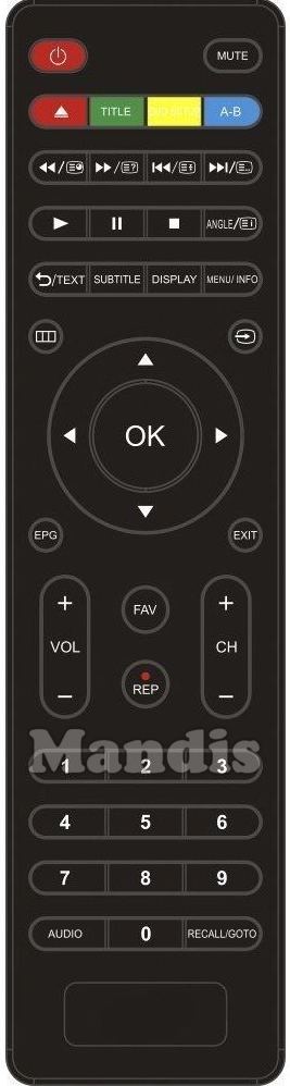 Power, Mute, Red/Eject, Green/Title, Yellow, Blue/A-B, <</[≡◷], >>/[≡?], I<</[≡÷], >>I/[≡...], Play, Pause, Stop, Angle/[≡i], Back/Text, Subtitle, Display, Menu Info, [ | | ], Input, EPG, Exit, Up, Down, Left, Right, OK, FAV, REC/REP, Vol+, Vol-, CH+, CH-, 1, 2, 3, 4, 5, 6, 7, 8, 9, 0, Audio, Recall/GOTO