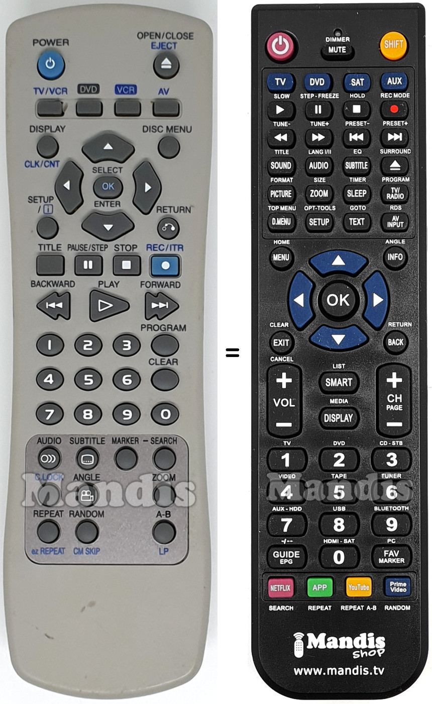 A continuació, us mostrarem la correspondència entre cada un dels botons del comandament original i el botó que realitza la mateixa funció en el comandament de substitució. En alguns casos, és possible que necessiti prémer la tecla SHIFT abans de prémer un altre botó per realitzar certes accions. Aquestes funcions addicionals sovint no s'utilitzen gaire i s'inclouen per facilitar la comprensió del comandament de substitució, o perquè el comandament original té més botons que el seu equivalent.