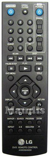 Power, Open / Close, 1, 2, 3, 4, 5, 6, 7, 8, 9, 0, Clear, Power TV, PR + / CH + TV, PR - / CH - TV, Vol + TV, Vol - TV, AV TV, << / Scan -, >> / Scan +, I<< / Skip -, >>I / Skip +, Pause / Step, Play, Stop, DVD Menu, Title, Up, Down, Right, Left, Enter, Display, Return, Audio, Subtitle, Angle, Setup, Marker, Search, Program, Zoom, Repeat, A-B, Resolution, *