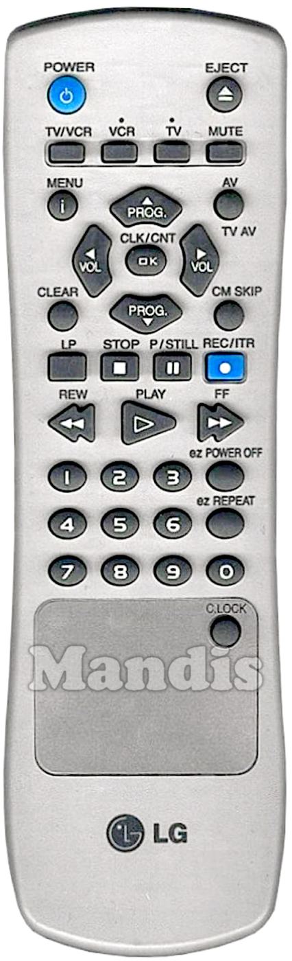 Power, Eject, TV/VCR, VCR, TV, Mute, i / Menu, AV / TV AV, Up / Prog.+, Down / Prog.-, Right / Vol+, Left / Vol-, OK / CLK/CNT, Clear, CM Skip, LP, Stop, Pause / P/Still, Rec / ITR, << REW, Play, FF >>, ez Power Off, ez Repeat, 1, 2, 3, 4, 5, 6, 7, 8, 9, 0, C.Lock