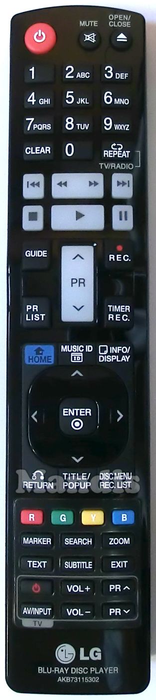 Power, Mute, Open/Close, 1, 2, 3, 4, 5, 6, 7, 8, 9, 0, Clear, Repeat/Tv/Radio, I<<, <<, >>, >>I, Stop, Pause, Play, Guide, Rec, PR List, Timer Rec., Home, Music ID, Info/Display, Return, Title/PopUp, Disc Menu/Rec List, Up, Down, Right, Left, Enter, Red, Green, Yellow, Blue, Marker, Search, Zoom, Text, Subtitle, Exit, Power Tv, AV/Input Tv, Vol+ Tv, Vol- Tv, PR+ Tv, PR- Tv, PR+, PR-