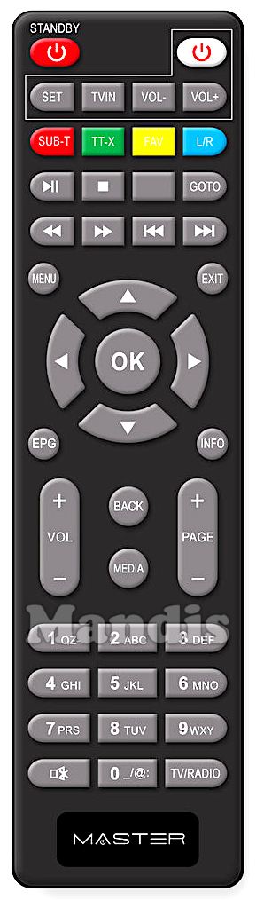 Standby, TV Power, Set, TVIN, TV Vol-, TV Vol+, Red / Sub-T, Green / TT-X, Yellow / Fav, Blue / L/R, Play / Pause, Stop, , Goto, <<, >>, I<<, >>I, Menu, Exit, Up, Left, OK, Right, Down, EPG, Info, Vol+, Vol-, Back, Media, Page+, Page-, 1, 2, 3, 4, 5, 6, 7, 8, 9, 0, Mute, TV/Radio
