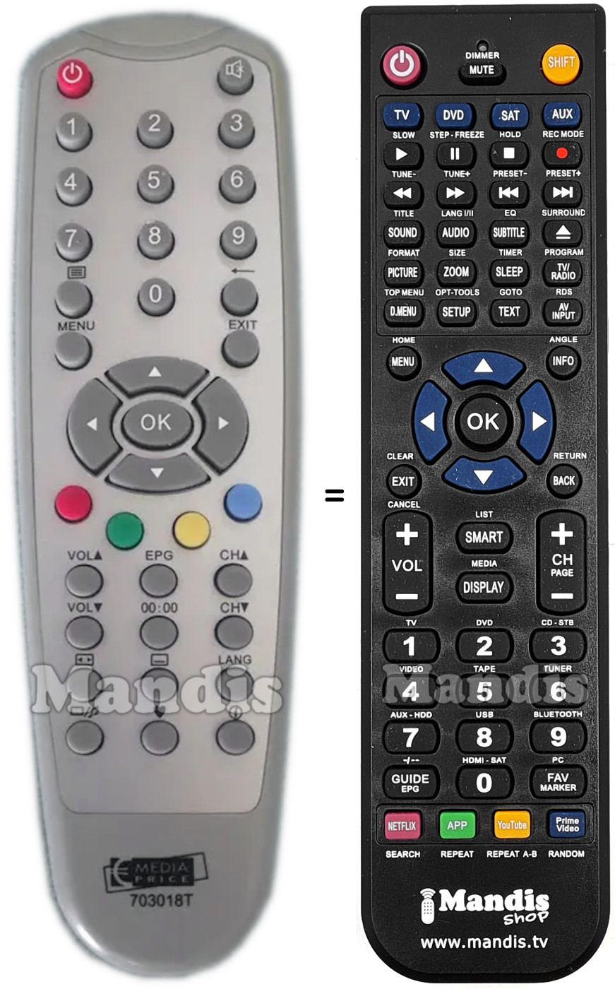 Aquest comandament a distància substitueix completament el teu 703018T en totes les seves funcions. No és un comandament universal, sinó una còpia exacta del teu original.