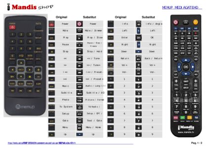 A continuació, us mostrarem la correspondència entre cada un dels botons del comandament original i el botó que realitza la mateixa funció en el comandament de substitució. En alguns casos, és possible que necessiti prémer la tecla SHIFT abans de prémer un altre botó per realitzar certes accions. Aquestes funcions addicionals sovint no s'utilitzen gaire i s'inclouen per facilitar la comprensió del comandament de substitució, o perquè el comandament original té més botons que el seu equivalent.