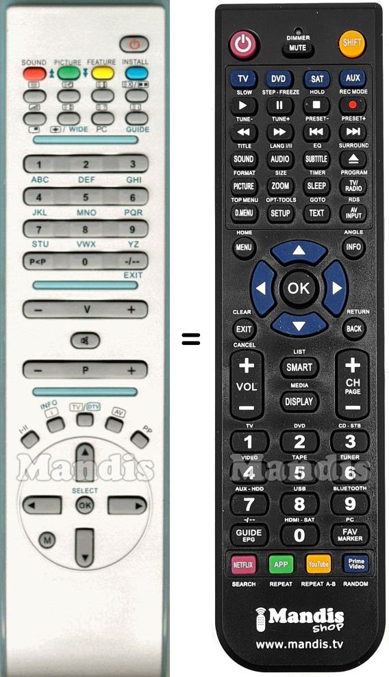 A continuació, us mostrarem la correspondència entre cada un dels botons del comandament original i el botó que realitza la mateixa funció en el comandament de substitució. En alguns casos, és possible que necessiti prémer la tecla SHIFT abans de prémer un altre botó per realitzar certes accions. Aquestes funcions addicionals sovint no s'utilitzen gaire i s'inclouen per facilitar la comprensió del comandament de substitució, o perquè el comandament original té més botons que el seu equivalent.