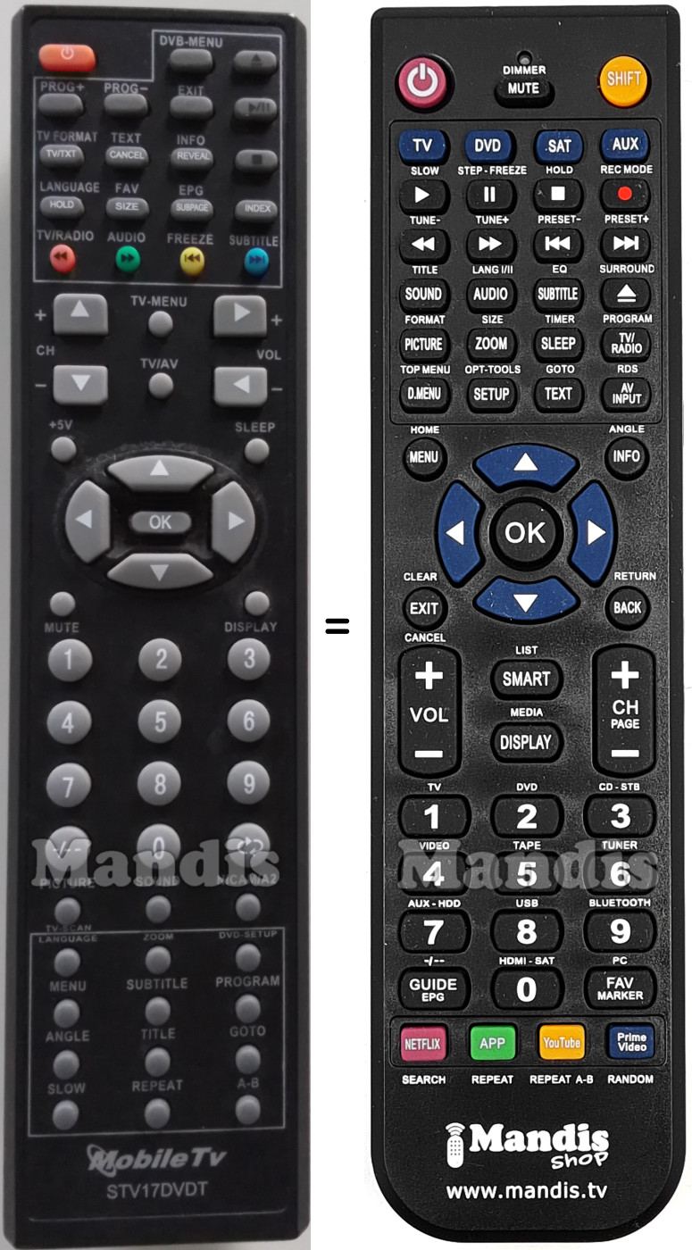 Aquest comandament a distància substitueix completament el teu STV17DVDT-1 en totes les seves funcions. No és un comandament universal, sinó una còpia exacta del teu original.