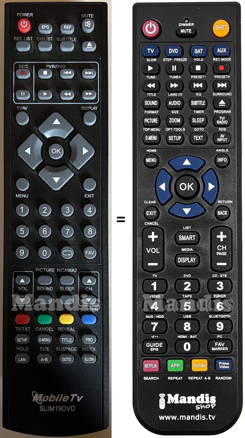 Aquest comandament a distància substitueix completament el teu SLIM19DVD en totes les seves funcions. No és un comandament universal, sinó una còpia exacta del teu original.