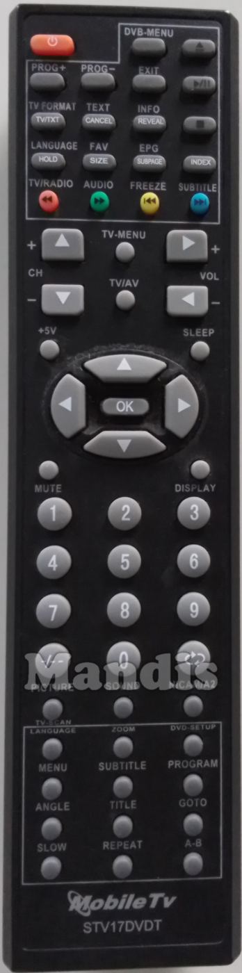 Comandament a distància original STV17DVDT-1 que serveix per televisors de la marca MOBILE TV. Es tracta d'un model original de comandament a distància.
