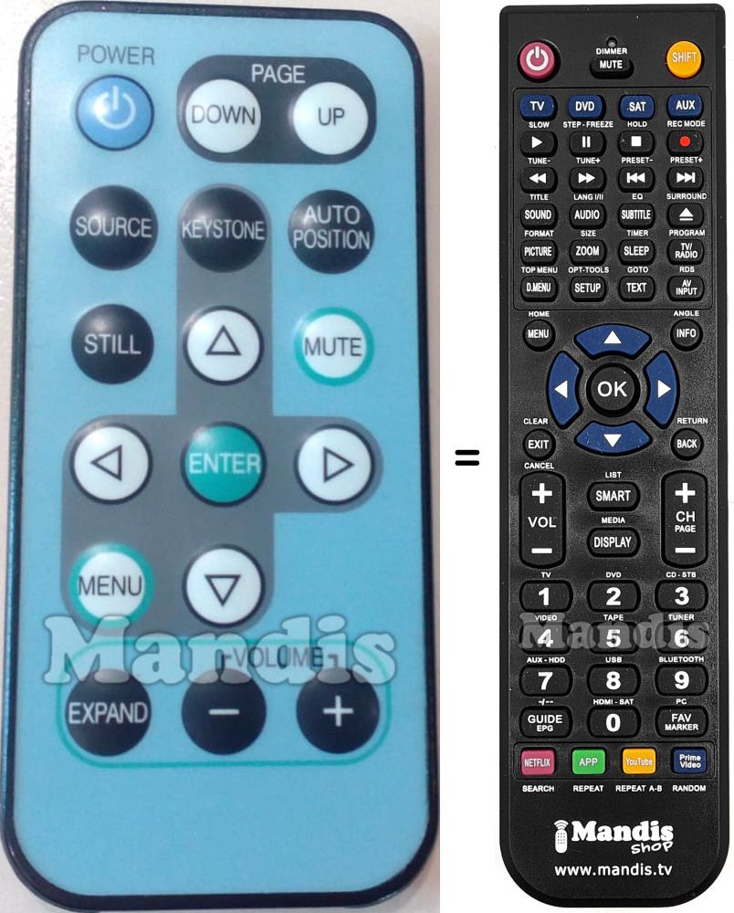 Sí, el comandament equivalent realitza totes les funcions, fins i tot quan el comandament original controla diversos aparells. Al comandament equivalent es poden programar els camps de diferents aparells (TV, DVD, SAT i AUX) d'aquesta manera es pot incloure totes les funcions del comandament original. Si visualitza el manual de les tecles (instruccions del comandament a distància) podrà comprovar que hi ha totes les funcions.