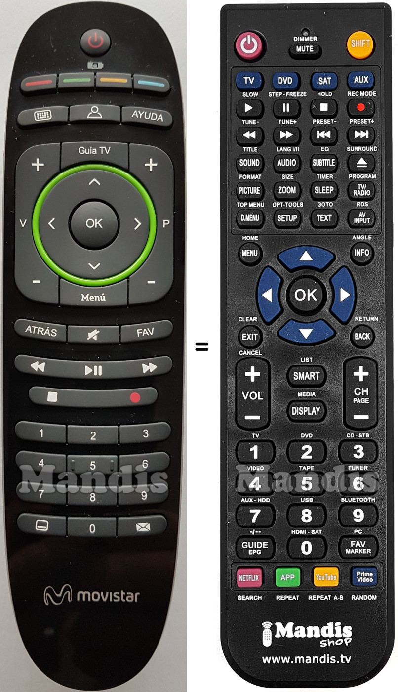 A continuació, us mostrarem la correspondència entre cada un dels botons del comandament original i el botó que realitza la mateixa funció en el comandament de substitució. En alguns casos, és possible que necessiti prémer la tecla SHIFT abans de prémer un altre botó per realitzar certes accions. Aquestes funcions addicionals sovint no s'utilitzen gaire i s'inclouen per facilitar la comprensió del comandament de substitució, o perquè el comandament original té més botons que el seu equivalent.