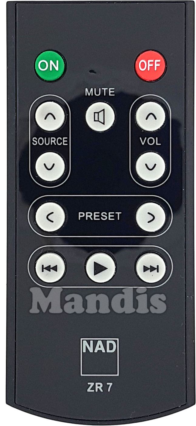 Comandament a distància original ZR7 que serveix per cadena hi-fi de la marca NAD. Es tracta d'un model original de comandament a distància.