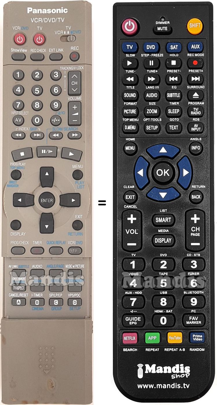A continuació, us mostrarem la correspondència entre cada un dels botons del comandament original i el botó que realitza la mateixa funció en el comandament de substitució. En alguns casos, és possible que necessiti prémer la tecla SHIFT abans de prémer un altre botó per realitzar certes accions. Aquestes funcions addicionals sovint no s'utilitzen gaire i s'inclouen per facilitar la comprensió del comandament de substitució, o perquè el comandament original té més botons que el seu equivalent.