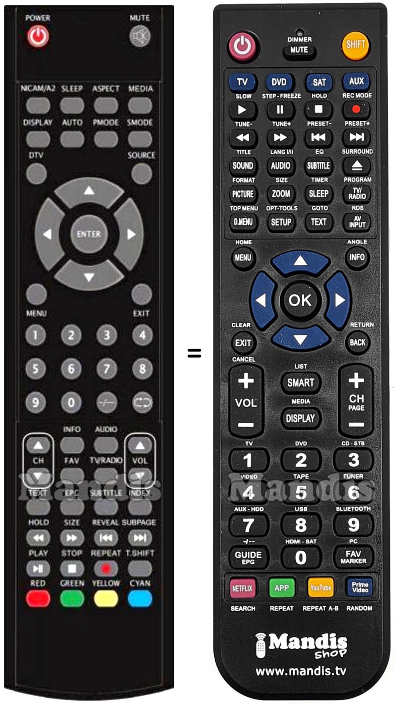 A continuació, us mostrarem la correspondència entre cada un dels botons del comandament original i el botó que realitza la mateixa funció en el comandament de substitució. En alguns casos, és possible que necessiti prémer la tecla SHIFT abans de prémer un altre botó per realitzar certes accions. Aquestes funcions addicionals sovint no s'utilitzen gaire i s'inclouen per facilitar la comprensió del comandament de substitució, o perquè el comandament original té més botons que el seu equivalent.