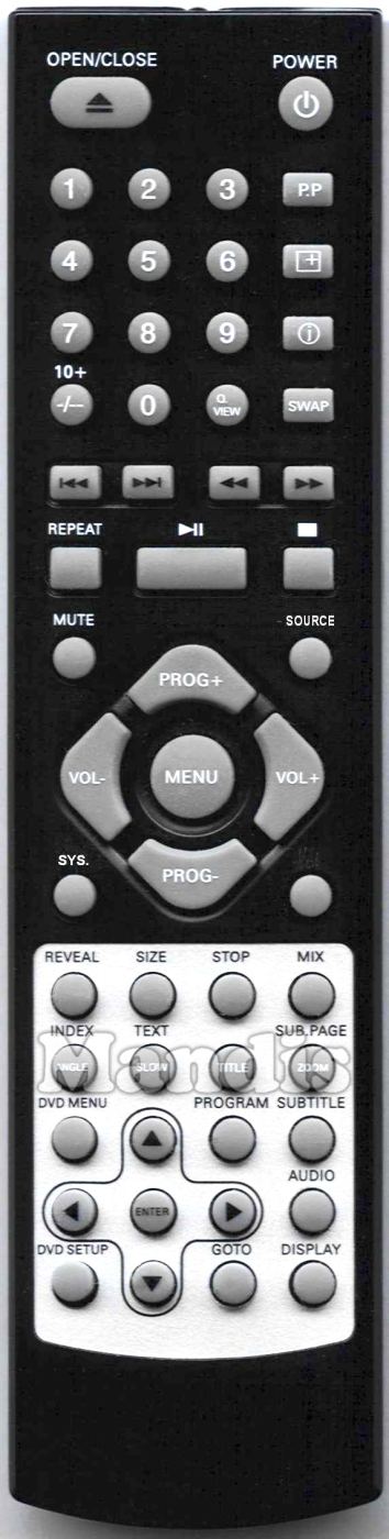 Open / Close, Power, 1, 2, 3, 4, 5, 6, 7, 8, 9, 0, -/-- / 10+, Q.View, P.P, [ +], ( j ), Swap, ▮◀◀, ▶▶▮, ◀◀, ▶▶, Repeat, ▶ / ▮▮, ◼, Mute, Source, Prog+, Prog-, Vol-, Vol+, Menu, Sys., --, Reveal, Size, Stop, Mix, Angle / Index, Slow / Text, Title, Zoom / Sub.Page, DVD Menu, Program, Subtitle, Audio, DVD Setup, Goto, Display, Up, Left, Enter, Right, Down