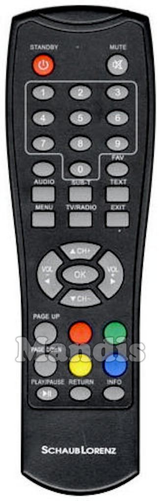 Standby, Mute, 1, 2, 3, 4, 5, 6, 7, 8, 9, 0, Info 2, Fav, Audio, Sub-T, Text, Menu, TV / Radio, Exit, Up / CH+, Right / Vol+, Left / Vol-, OK, Down / CH-, Page Up, Page Down, Red, Green, Yellow, Blue, Play / Pause, Return, Info