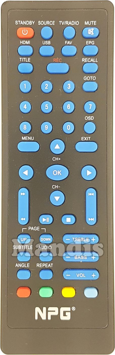 Standby, Source, Tv/Radio, Mute, HDMI, USB, FAV, EPG, Title, Recall, Rec, Goto, Menu, Exit, 1, 2, 3, 4, 5, 6, 7, 8, 9, 0, Goto, Up/CH+, Down/CH-, Right, Left, OK, >>, <<, I<<, >>I, Stop, Play/Pause, Page Up, Page Down, Subtitle, Audio, Angle, Repeat, Treble+, Treble-, Bass+, Bass-, Vol+, Vol-, Red, Green, Yellow, Blue