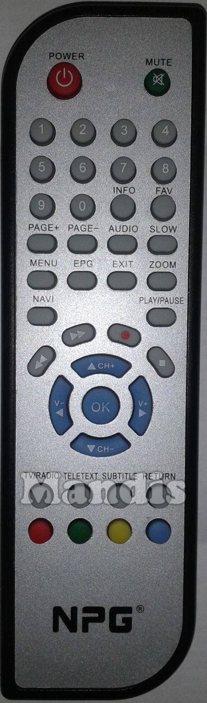 Power, Mute, 1, 2, 3, 4, 5, 6, 7, 8, 9, 0, Info, FAV, Page+, Page-, Audio, Slow, Menu, EPG, Exit, Zoom, Play/Pause, <<, >>, Rec, Stop, Up/CH+, Down/CH-, Right/Vol+, Left/Vol-, OK, Tv/Radio, Teletext, Subtitle, Return, Red, Green, Yellow, Blue, Navi