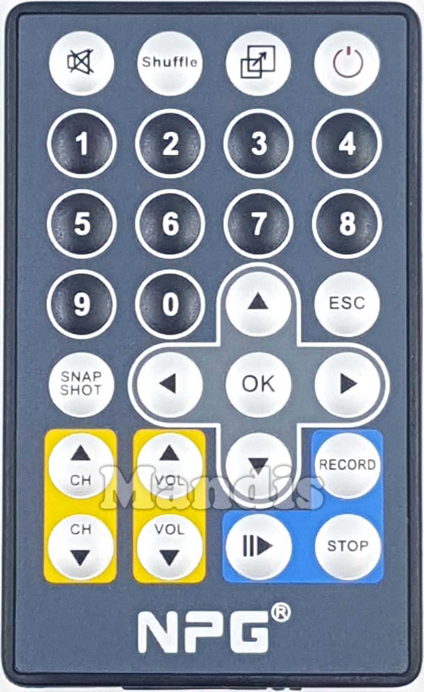 Mute, Shuffle, [/], Power, 1, 2, , 3, 4, 5, 6, 7, 8, 9, 0, ESC, Snapshot, Up, OK, Down, Right, Left, CH+, CH-, Vol+, Vol-, Pause/Play, Record, Stop
