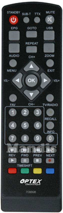 Comandament a distància original 708898-1 que serveix per tdt/sat de la marca OPTEX. Es tracta d'un model original de comandament a distància.