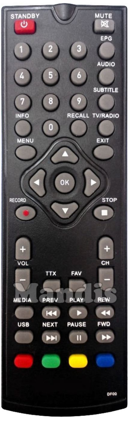 Standby, Mute, 1, 2, 3, 4, 5, 6, 7, 8, 9, 0, Info, Recall, EPG, Audio, Subtitle, TV / Radio, Menu, Exit, Up, Right, Down, Left, OK, Record, Stop, Vol +, Vol -, TTX, Fav, CH +, CH -, Media, I<< Prev, Play, << REW, USB, Next >>I, Pause, FWD >>, Red, Green, Yellow, Blue