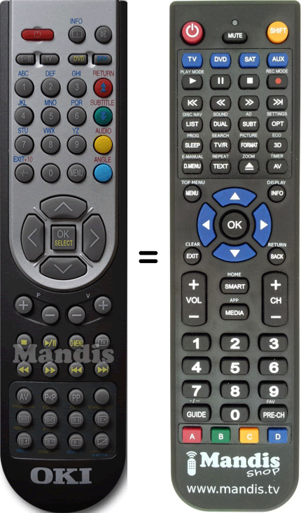 Aquest comandament a distància substitueix completament el teu RC1165 (OKIRC1165) en totes les seves funcions. No és un comandament universal, sinó una còpia exacta del teu original.