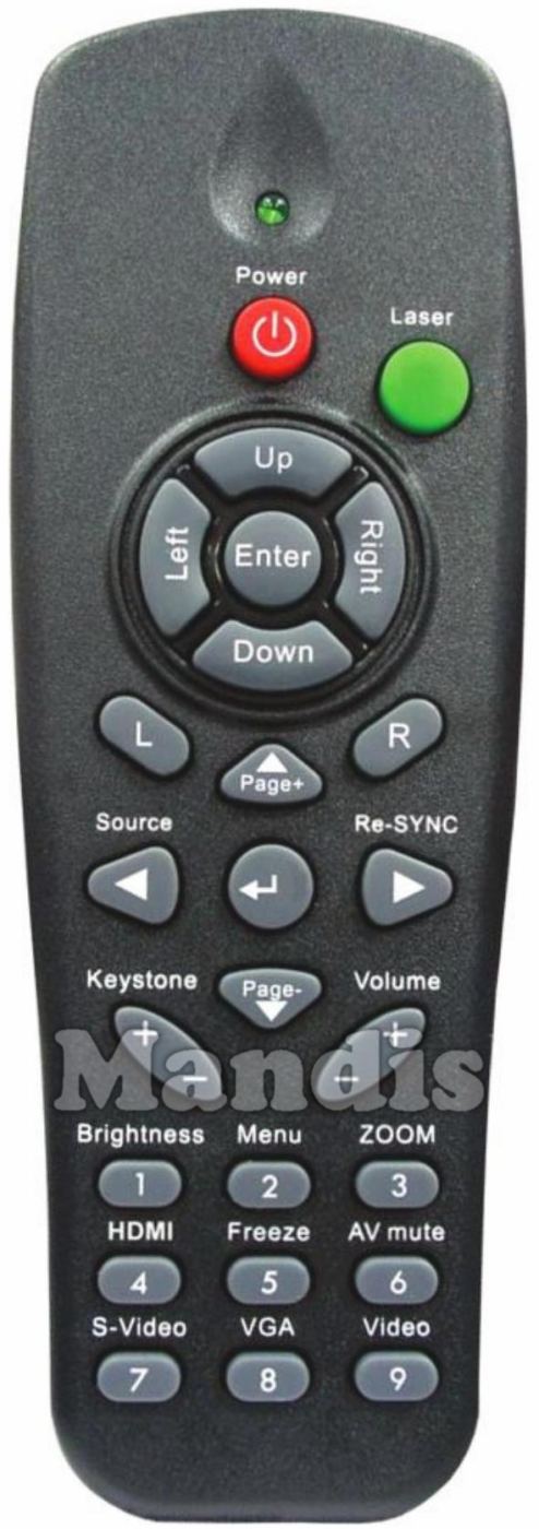 Power, Laser, Up, Left, Enter, Right, Down, L, R, ▲ / Page +, ▼ / Page -, ◀ / Source, ↵, ▶ / Re-SYNC, Keystone +, Keystone -, Volume +, Volume -, 1 / Brightness, 2 / Menu, 3 / ZOOM, 4 / HDMI, 5 / Freeze, 6 / AV mute, 7 / S-Video, 8 / VGA, 9 / Video