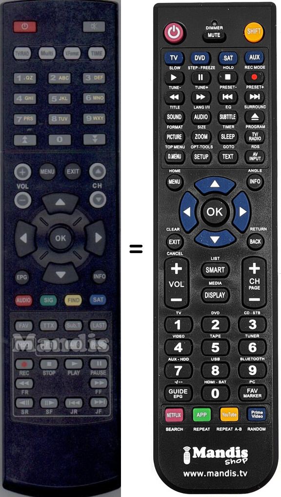 Comandament a distància que substitueix a l'original en totes les seves funcions. No es tracta d'un comandament universal sinó d'una còpia que substitueix l'original. Rebrà el comandament completament preparat per fer-lo funcionar només necessita posar-li les piles. No cal programar-lo. Té total garantia de que el comandament cumplirà amb les mateixes funcions de l'original.