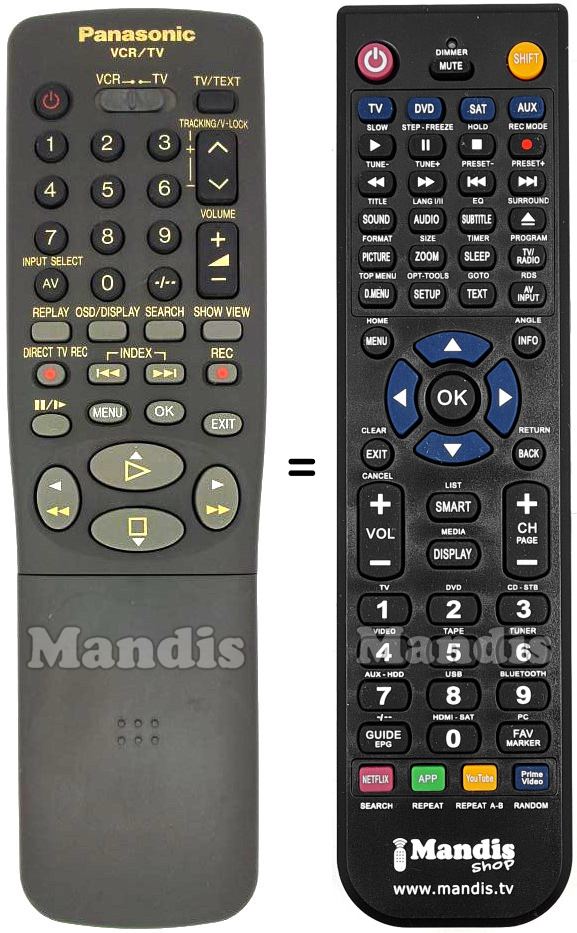 Aquest comandament a distància fa totes les funcions del comandament original: Power, Tv/Text, 1, 2, 3, 4, 5, 6, 7, 8, 9, 0, AV/Input Select, Tracking/V-Lock+, Tracking/V-Lock-, Vol+, Vol-, -/--, Replay, OSD/Display, Search, Show View, Direct Tv Rec, I<<, >>I, Rec, Pause/Step, Menu, OK, Exit, Play/Up, Stop/Down, >>/Right, <</Left, Prog/Check+, Prog/Check-, Date+, Date-, On+, On-, Off+, Off-, Prog/Check, Cancel, Nothing1, Timer Rec, Reset, Nothing2, Nothing3, VPS/PDC, AV Link, Tv Aspect