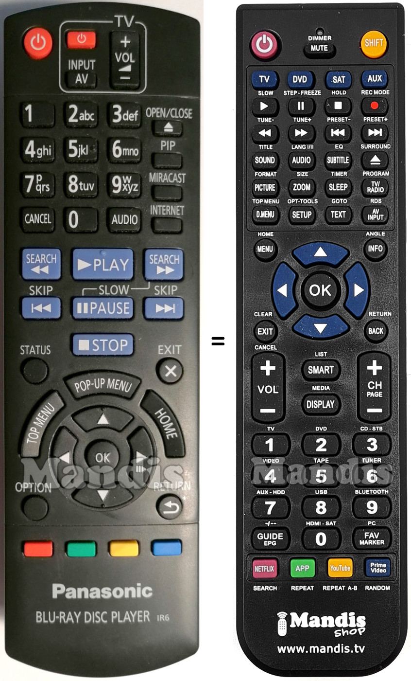 A continuació, us mostrarem la correspondència entre cada un dels botons del comandament original i el botó que realitza la mateixa funció en el comandament de substitució. En alguns casos, és possible que necessiti prémer la tecla SHIFT abans de prémer un altre botó per realitzar certes accions. Aquestes funcions addicionals sovint no s'utilitzen gaire i s'inclouen per facilitar la comprensió del comandament de substitució, o perquè el comandament original té més botons que el seu equivalent.