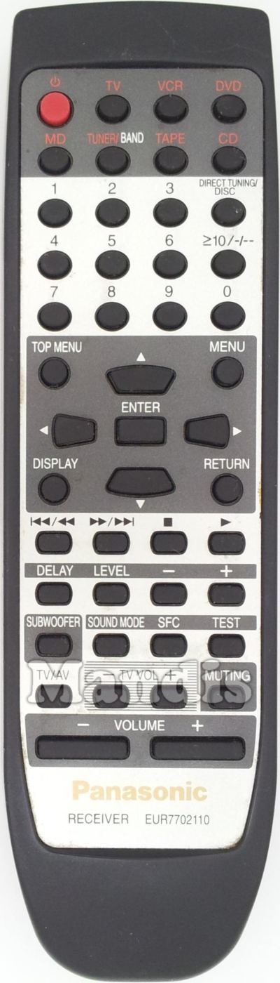 Power, TV, VCR, DVD, MD, Tuner / Band, TAPE, CD, 1, 2, 3, 4, 5, 6, 7, 8, 9, Direct Tunning / Disc, -/--, 0, TOP MENU, MENU, DISPLAY, RETURN, Up, Right, Down, Left, ENTER, I<< / <<, >> / >>I, Stop, Play, DELAY, LEVEL, -, +, SUBWOOFER, SOUND MODE, SFC, TEST, TV / AV, TV VOL -, TV VOL +, MUTING, VOLUME -, VOLUME +