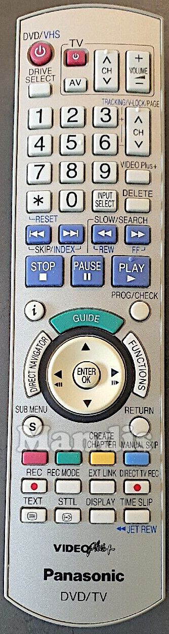 DVD/VHS Power, TV Power, TV AV, TV CH+, TV CH-, TV Volume+, TV Volume-, Drive Select, 1, 2, 3, 4, 5, 6, 7, 8, 9, 0, * / Reset, Input Select, CH + Tracking/V-Lock +, CH - Tracking/V-Lock -, VIDEO Plus+, Delete, I<< Skip/Index, >>I Skip/Index, << REW, >> FF, Stop, Pause, Play, i, Prog/Check, Guide, Direct Navigator, Functions, Up, Left / <II, Enter / OK, Down, Right 7 II>, Sub Menu, Return, Red, Green, Yellow / Create Chapter, Blue / Manual Skip, Rec, Rec Mode, Ext Link, Direct TV Rec, Text, STTL, Display, Time Slip / << Jet Rew
