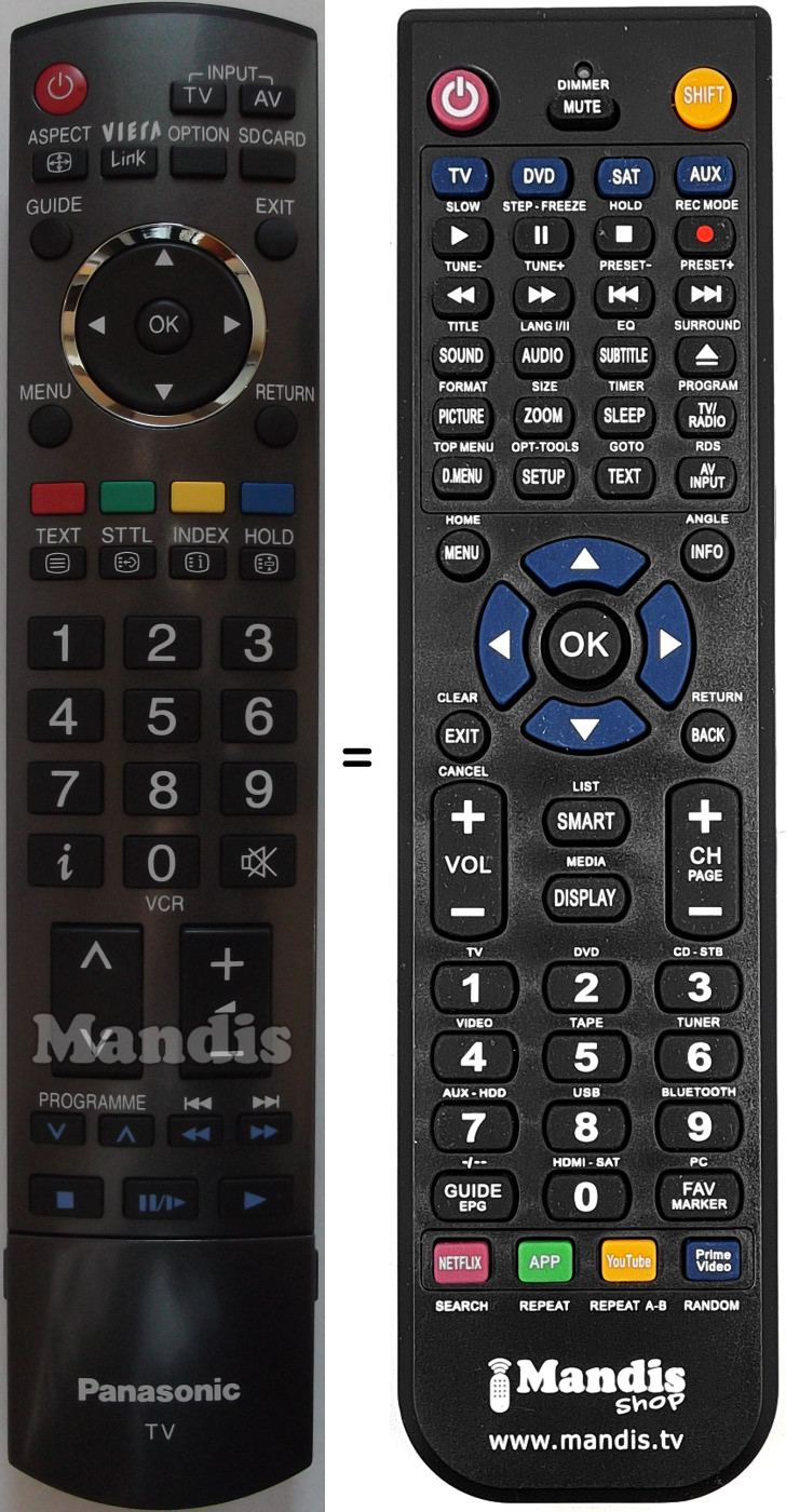 Comandament a distància que substitueix el comandament N2QAYB000114 en totes les seves funcions. No es tracta d'un comandament universal sinó d'una còpia que substitueix l'original. Rebrà el comandament completament preparat per fer-lo funcionar només necessita posar-li les piles. No cal programar-lo. Té total garantia de que el comandament cumplirà amb les mateixes funcions de l'original.