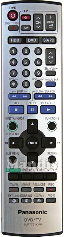 Power DVD, Direct Tv Rec, Power Tv, AV Tv, CH+ Tv, CH- Tv, Volume+, Volume-, HDD, DVD, SD/PC, 1, 2, 3, 4, 5, 6, 7, 8, 9, 0, Cancel, INput Select, Show View, Manual Skip, ▮◀◀ Skip, Skip ▶▶▮, ◀◀ Slow/Search, Slow/Search ▶▶, CH+, CH-, ◼ Stop, ▮▮ Pause, ▶ Play/x1.3, Direct Navigator/Top Menu, Functions, Sub Menu, Return, Up, Down, Right / ▮▮▶, Left / ◀▮▮, Enter, Prog/Check, Display, Status, Time Slip, Timer, Erase, Rec Mode, Rec, Ext Link, Dubbing, Create Chapter, Audio