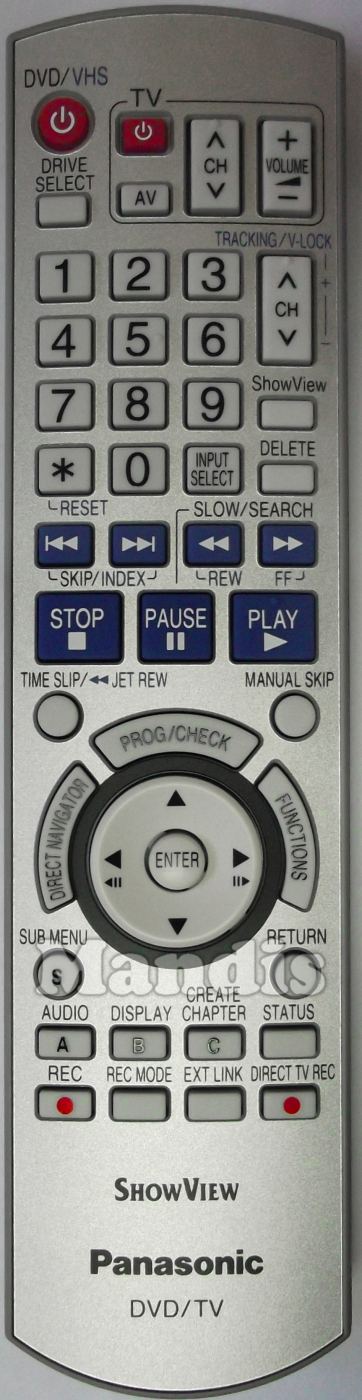 DVD/VHS Power, Drive Select, TV Power, TV AV, TV CH +, TV CH -, TV Volume +, TV Volume -, 1, 2, 3, 4, 5, 6, 7, 8, 9, 0, * / Reset, Input Select, CH + Tracking/V-Lock +, CH - Tracking/V-Lock -, ShowView, Delete, I<< Skip/Index +, >>I Skip/Index -, << Rew, >> FF, Stop, Pause, Play, Time Slip / << Jet Rew, Manual Skip, Direct Navigator, Prog / Check, Functions, Up, Down, Right / II>, Left / <II, Enter, Sub Menu, Return, Audio / A, Display / B, Creat Chapter / C, Status, Rec, Rec Mode, Ext Link, Direct TV Rec