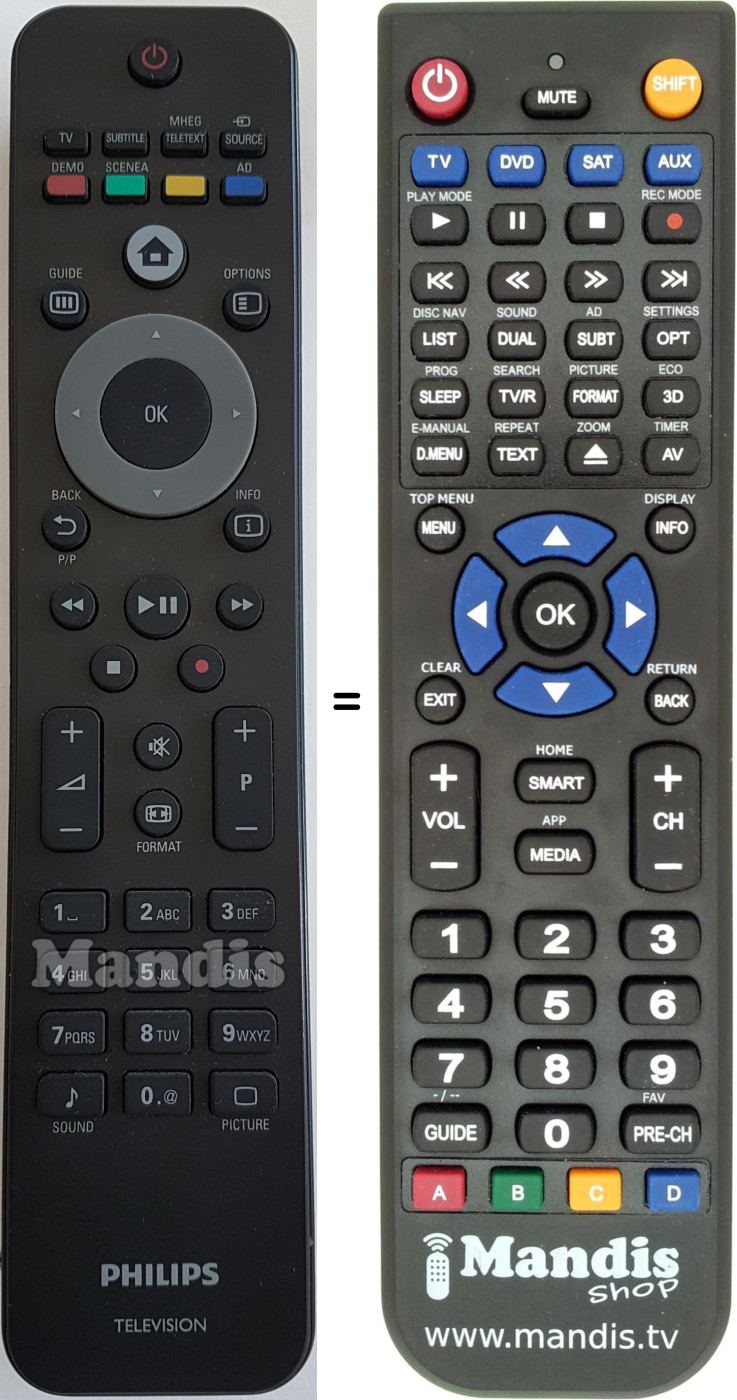 A continuació, us mostrarem la correspondència entre cada un dels botons del comandament original i el botó que realitza la mateixa funció en el comandament de substitució. En alguns casos, és possible que necessiti prémer la tecla SHIFT abans de prémer un altre botó per realitzar certes accions. Aquestes funcions addicionals sovint no s'utilitzen gaire i s'inclouen per facilitar la comprensió del comandament de substitució, o perquè el comandament original té més botons que el seu equivalent.