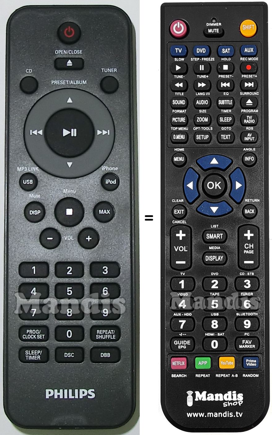 A continuació, us mostrarem la correspondència entre cada un dels botons del comandament original i el botó que realitza la mateixa funció en el comandament de substitució. En alguns casos, és possible que necessiti prémer la tecla SHIFT abans de prémer un altre botó per realitzar certes accions. Aquestes funcions addicionals sovint no s'utilitzen gaire i s'inclouen per facilitar la comprensió del comandament de substitució, o perquè el comandament original té més botons que el seu equivalent.