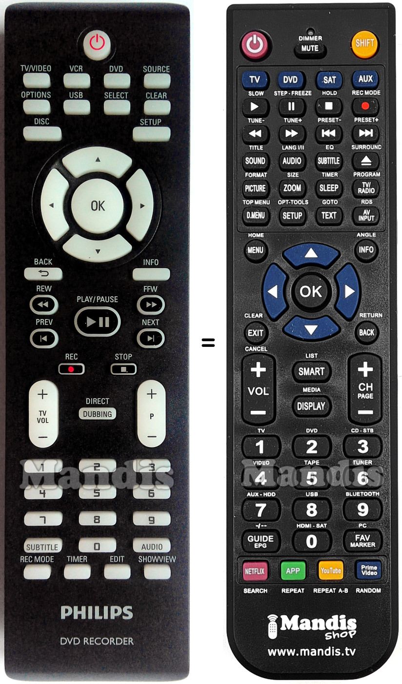 A continuació, us mostrarem la correspondència entre cada un dels botons del comandament original i el botó que realitza la mateixa funció en el comandament de substitució. En alguns casos, és possible que necessiti prémer la tecla SHIFT abans de prémer un altre botó per realitzar certes accions. Aquestes funcions addicionals sovint no s'utilitzen gaire i s'inclouen per facilitar la comprensió del comandament de substitució, o perquè el comandament original té més botons que el seu equivalent.