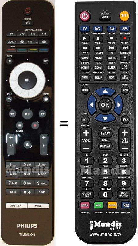 Aquest comandament a distància fa totes les funcions del comandament original: Power, Source, TV, DVD, STB, HTS, Teletext, [1|2], Subtitle, Format, Red / Demo, Green, Yellow, Blue, Guide, Info, Up, Right, Down, Left, OK, Back, Menu, <<, Play / Pause, >>, Stop / Cancel, Rec, Vol +, Vol -, Mute, P +, P -, 1, 2, 3, 4, 5, 6, 7, 8, 9, 0, Clock, P↔P, Ambilight, Mode